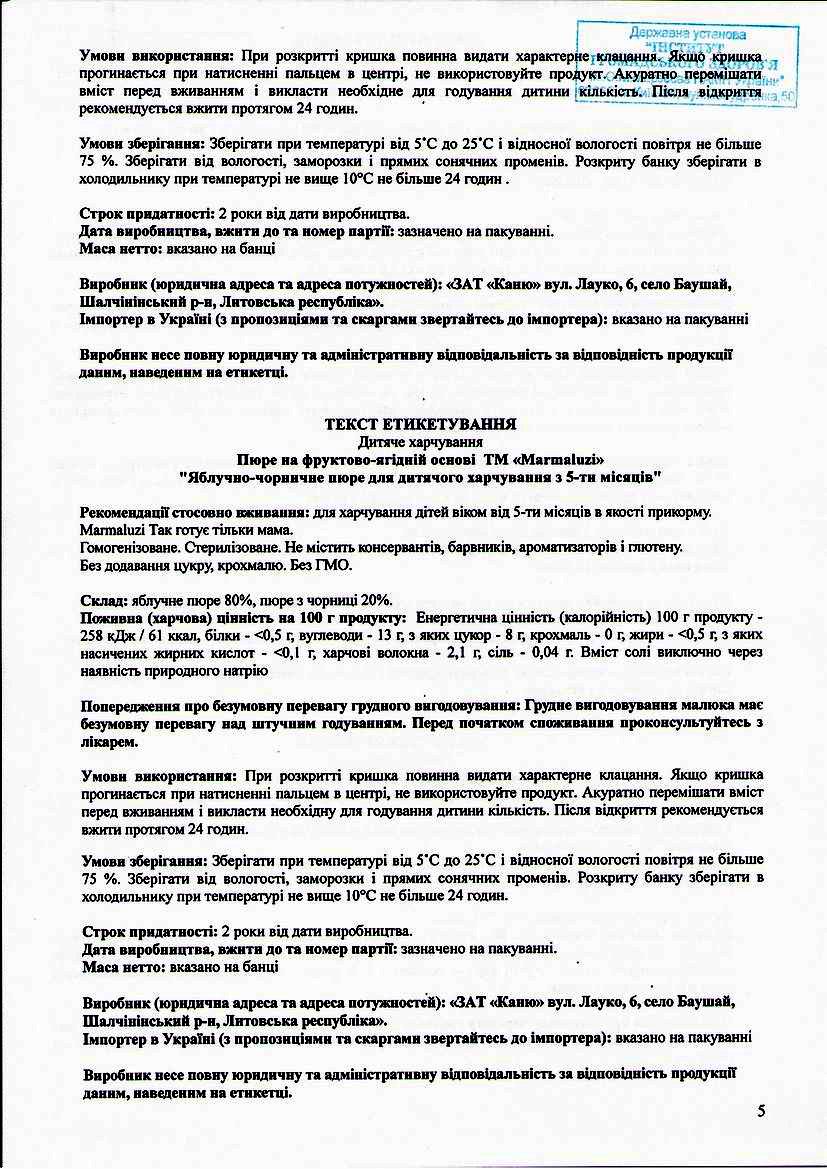 Також стаття 11 Закону України «Про дитяче харчування» від 14 вересня 2006 року № 142-V містить вимогу щодо обов'язкового затвердження тексту маркування центральним органом виконавчої влади, що забезпечує формування державної політики у сфері охорони здоров’я.